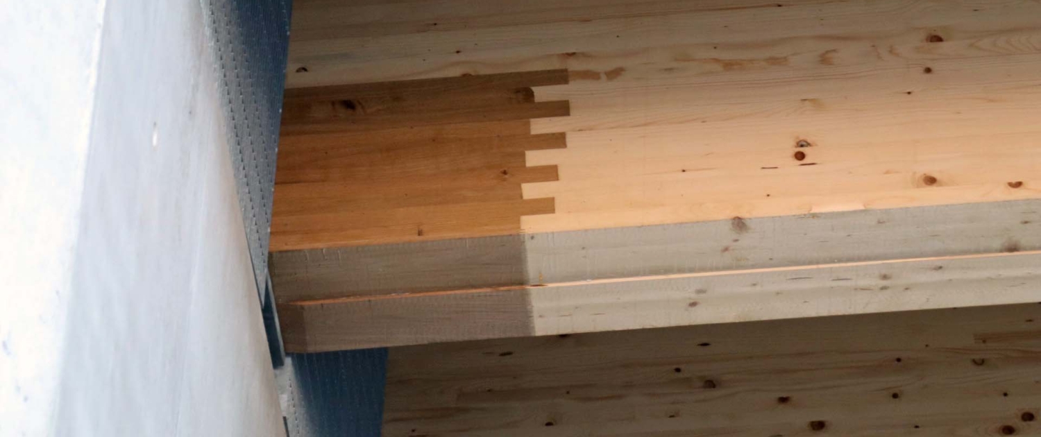 Bij het viaduct in Koppigen viel nog iets op: de uiteinden van de zachthouten gelamineerde liggers waren gemaakt van hardhout. Eikenhout in dit geval. Een slimme oplossing gezien de grote druk die de houten liggers bij de oplegging moeten weerstaan. Toch staat de regelgeving in Nederland zo’n oplossing (nog?) niet toe.