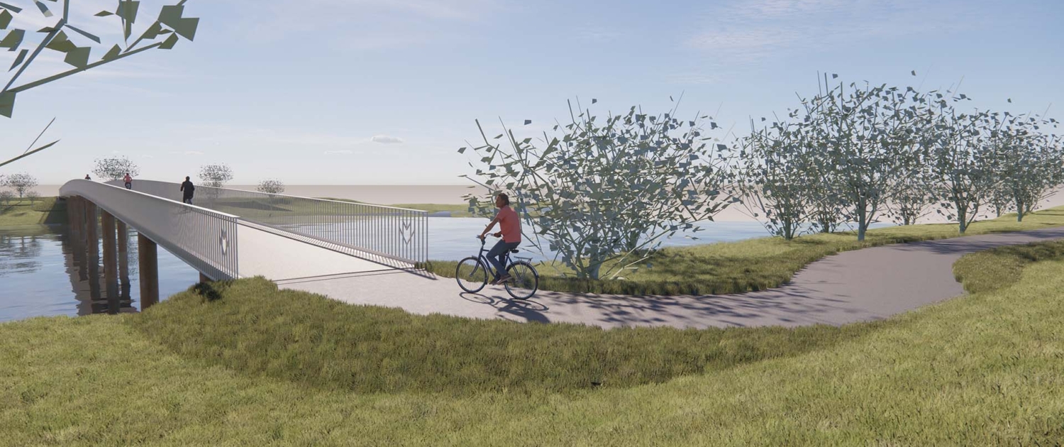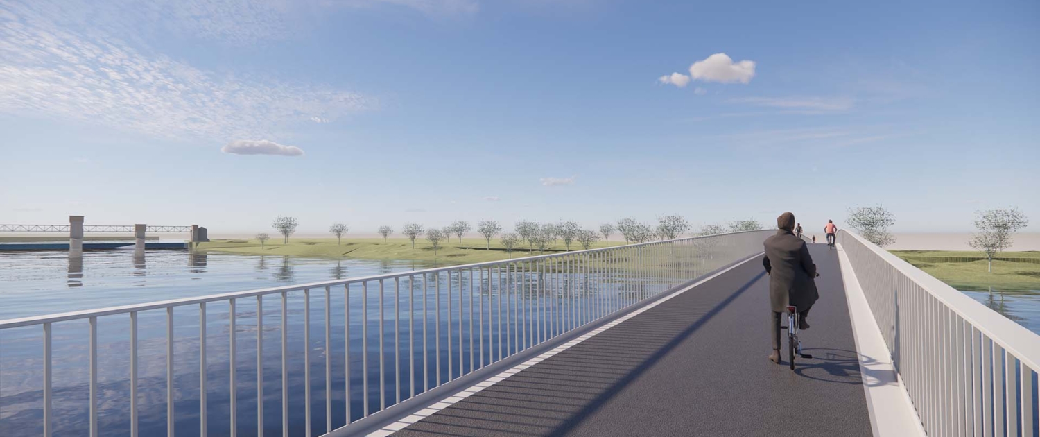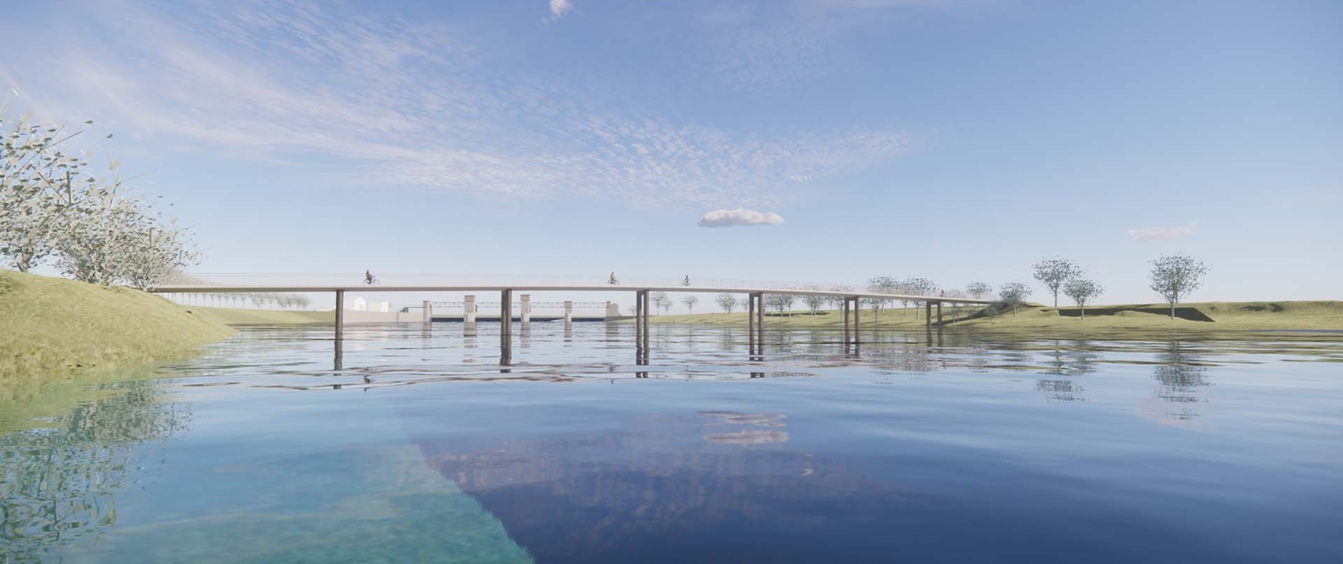 Voor de gemeente Maastricht ontwierpen we deze 140 meter lange fietsbrug over de Grensmaas nabij de stuw van Borgharen. Het ontwerp is ingetogen, zodat de brug naadloos opgaat in de omgeving. Een slank dek op poten, met grote overspanningen en een zorgvuldig ontworpen spijlenhekwerk zonder balusters.
