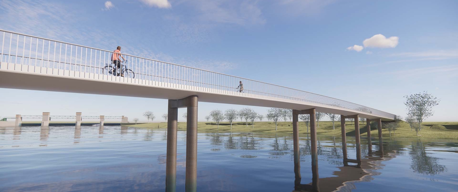 Bij het ontwerp van deze fiets- en voetgangersbrug die deels onder waterniveau ligt, speelde de afstemming tussen comfort, kosten en ruimtelijke inpassing een grote rol. Verder besteedden we veel aandacht aan de sociale veiligheid. Doordat de brug vrij ligt van de landhoofden en steunpunten van de Buitenrustbruggen en ver bij de verkeersbruggen vandaan aanlandt, ontstaat een overzichtelijk geheel.