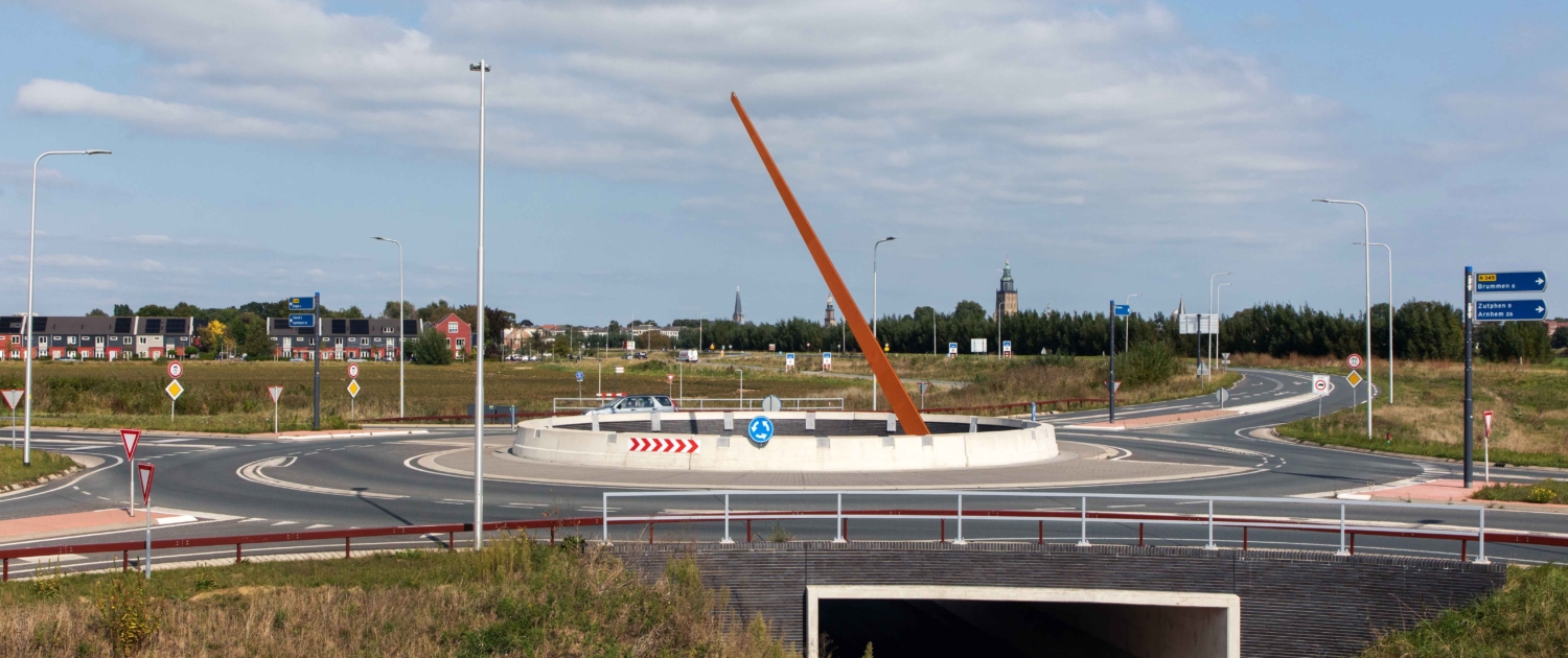 Om de verkeersoverlast in De Hoven (pal tegenover Zutphen, aan de IJssel) te beperken, legt de provincie Gelderland een ringweg rond het dorp aan. De nieuwe weg krijgt twee ongelijkvloerse kruizingen. De provincie heeft ons gevraagd het ontwerp voor de fietsonderdoorgangen te maken. Een markante cortenstalen naald maakt het hart van de rotonde tot zonnewijzer.