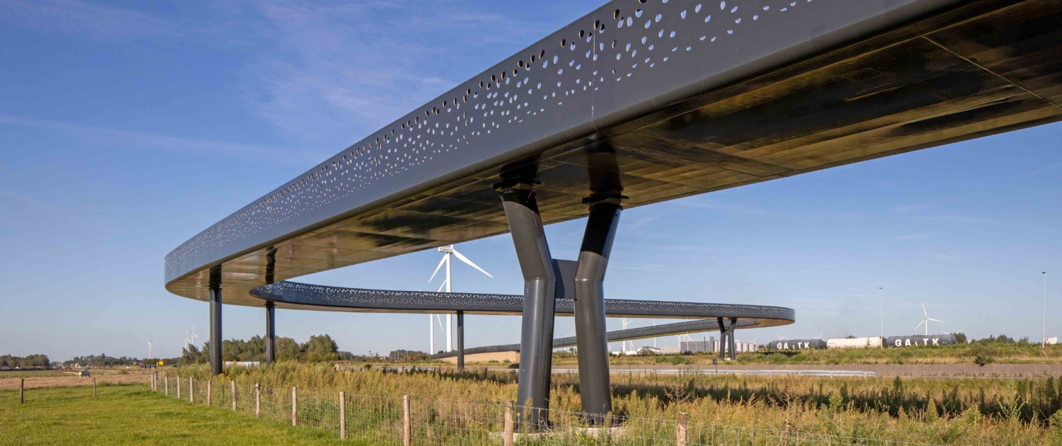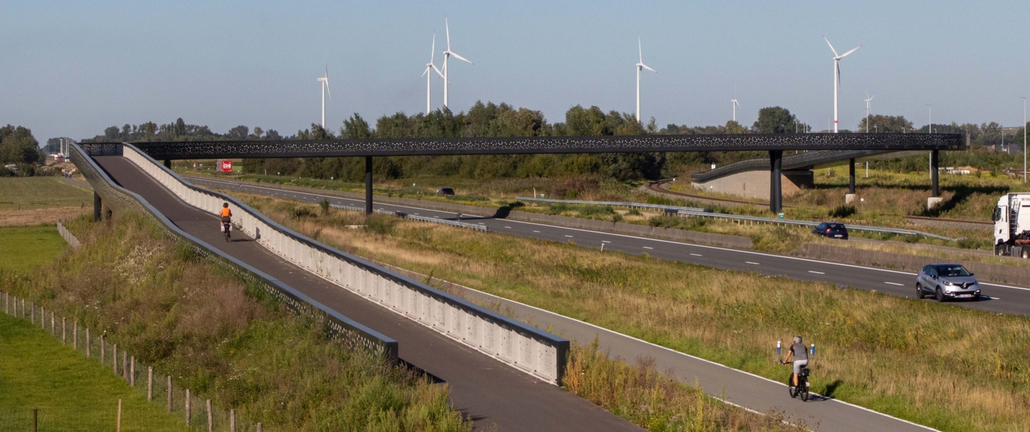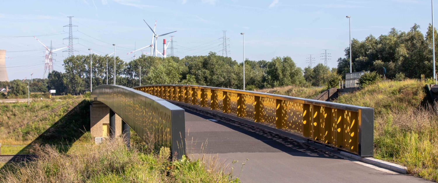 Ons beeldkwaliteitsplan, dat we hebben vastgelegd in een ontwerphandboek Kunstwerkenarchitectuur, stelt voor de westelijke zone met haar vele dorpsstraten stalen fietsbruggen voor met dragende hekwerken. In die dragende stalen balustrade komen perforaties die onderaan klein zijn en naar boven toe groter worden. De buitenzijde van de constructie is donkergrijs, de binnenzijde verschilt per brug en heeft een frisse kleur. Zo is elke brug uniek, maar zijn ze ook gelijk.