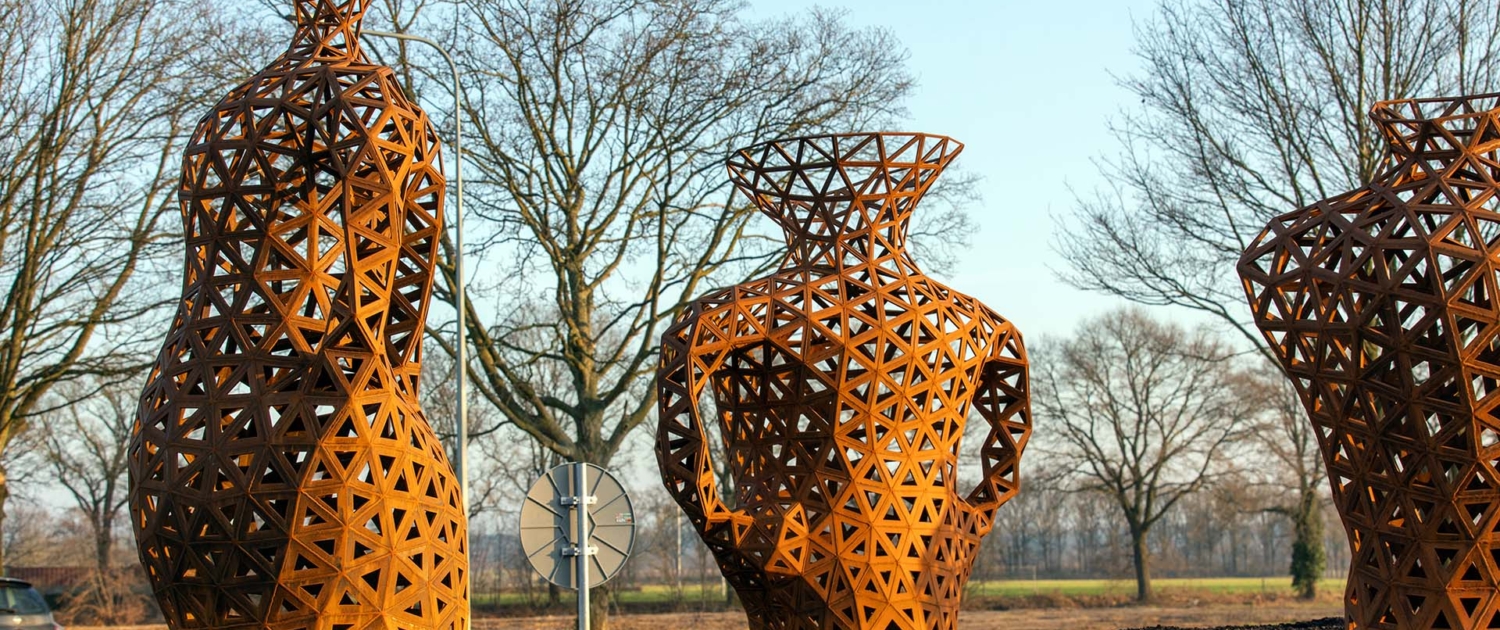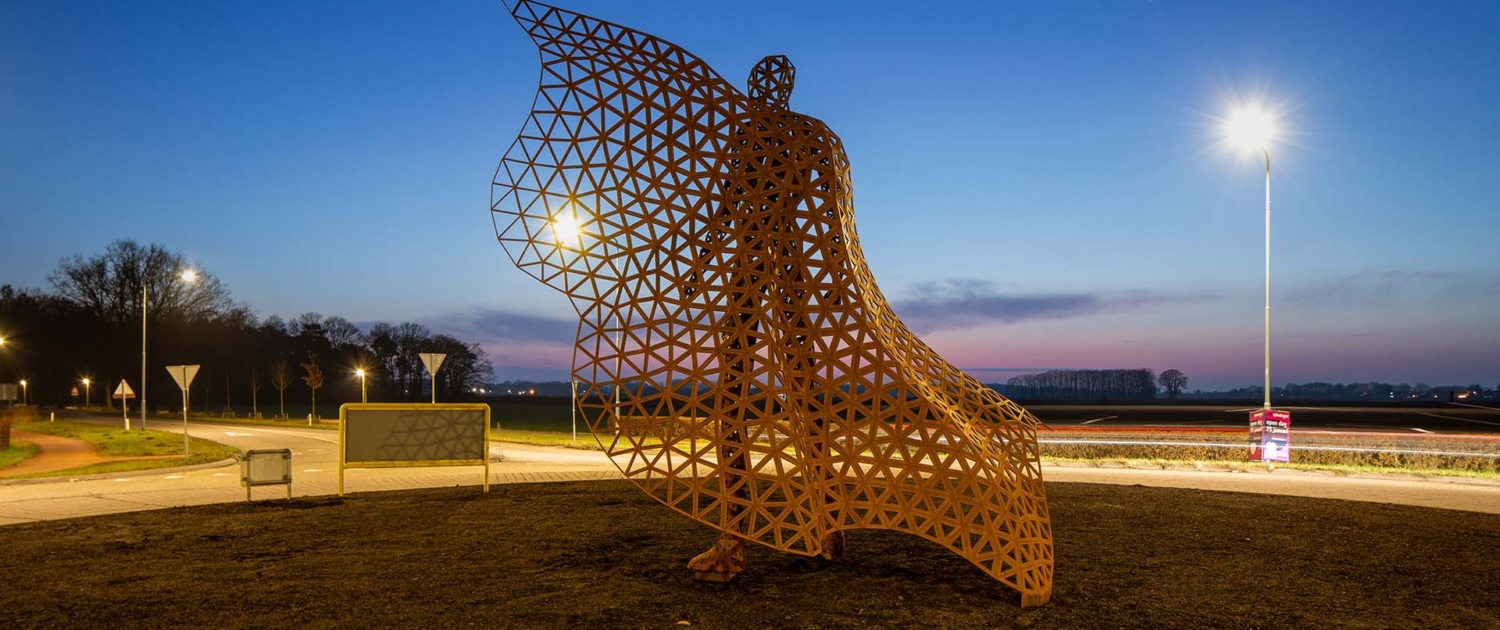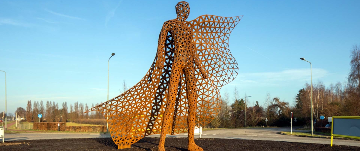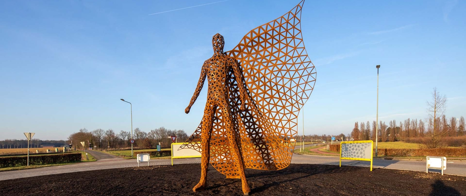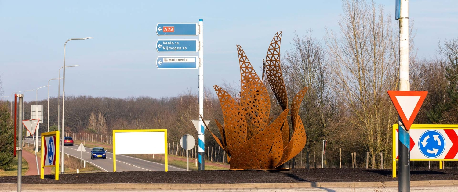 Naast de rotondekunstwerken ontwierpen we ook een cortenstalen wimpel, die de gemeente op plekken naar keuze langs de weg zal plaatsen. Deze zijn eveneens in 3D ontworpen en door Mannen van Staal geproduceerd.