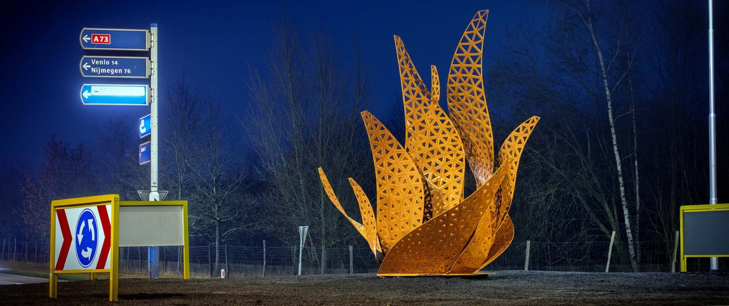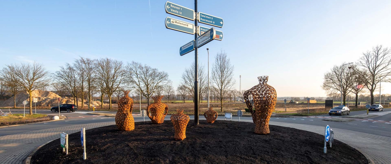 Het Limburgse Beesel staat bekend als drakendorp. De draak zit in het logo van de gemeente, elke zeven jaar vindt er het spectaculaire Draaksteken plaats en op de toegangsroute staat een groot beeld van een draak. De gemeente is bezig haar identiteit verder te versterken in de openbare ruimte, onder meer door ook op andere rotondes kunstwerken te plaatsen die verwijzen naar de legende van Sint Joris en de Draak. Wij maakten het ontwerp voor drie nieuwe kunstobjecten op de Rijksweg tussen Reuver en Heide.