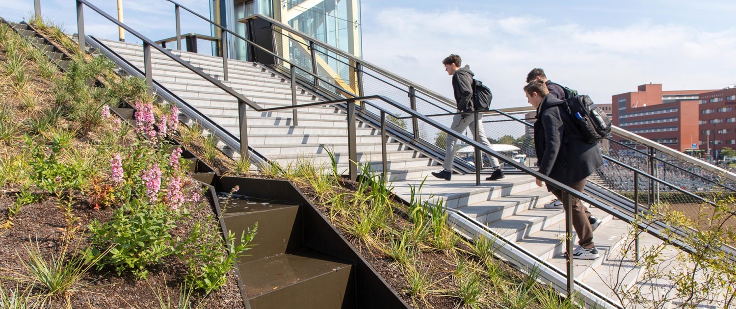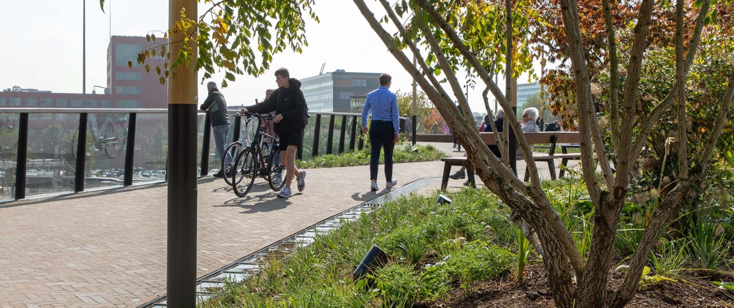 De opbouw van het brugdek is zorgvuldig uitgedacht en ontworpen om de waterdichtheid van de toplagen te garanderen. Bovenop het CLT brugdek ligt een dubbeldikke EPDM-laag, daar bovenop een uitgekiend systeem voor wateropvang en infiltratie, zowel in de plantvakken als onder de bestrating.