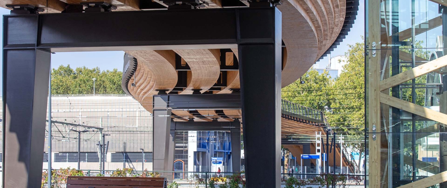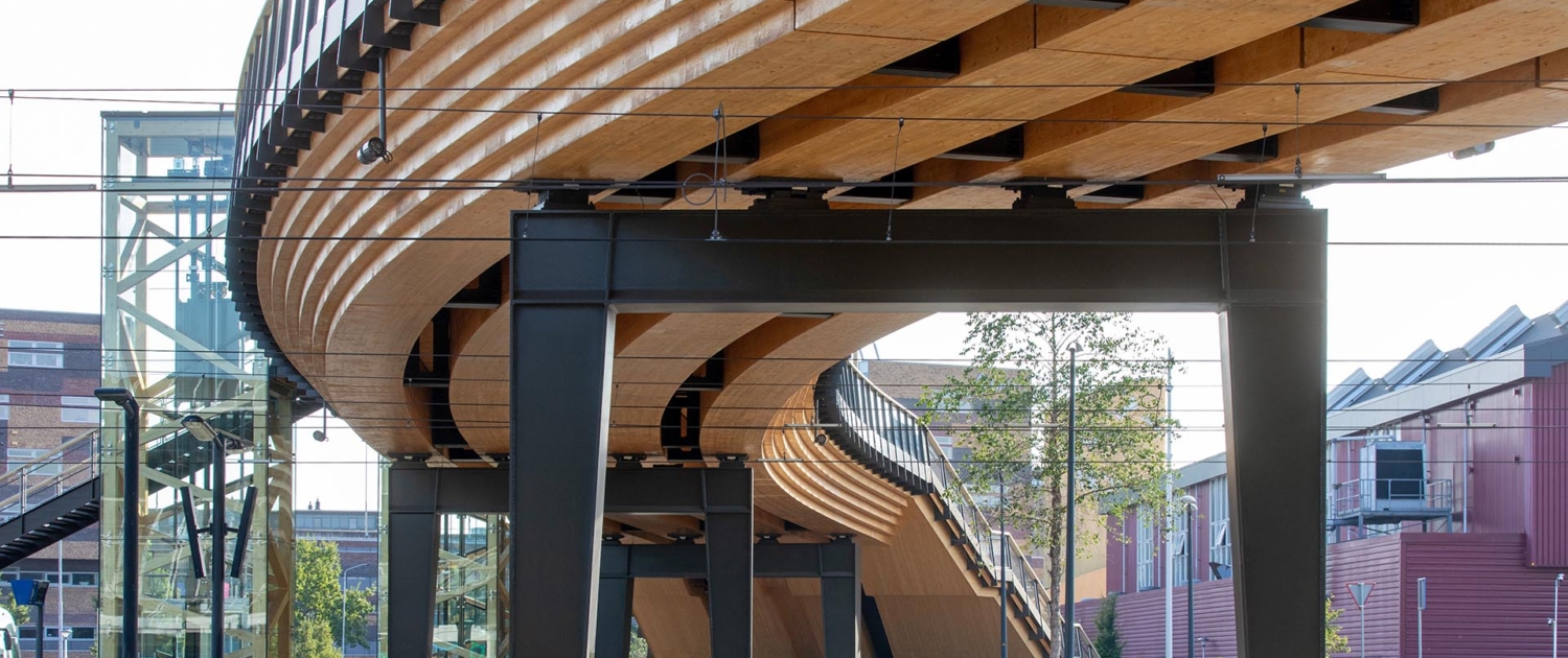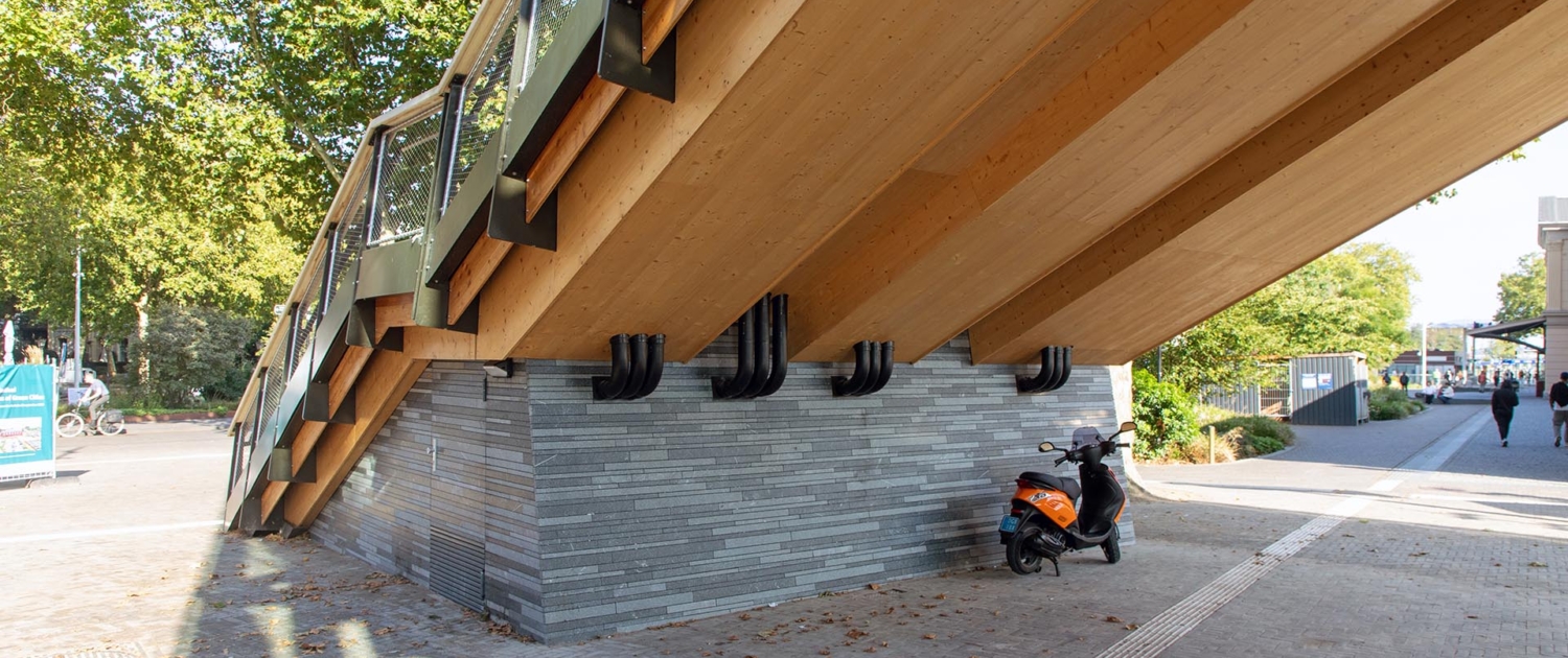 Duurzaamheid stond hoog in het vaandel bij opdrachtgever en ontwerpteam. Daarom is gekozen voor een beeldbepalende brugdekconstructie in Europees zachthout. Voor een brug van deze afmetingen is dat al redelijk uniek, maar de passerelle combineert de houten draagconstructie ook nog met een 15 cm dik brugdek in cross-laminated timber (CLT) en houten liftschachten. Grensverleggende ontwerpkeuzes, die niet zonder uitdaging waren. Zeker gezien de beplanting op de brug en de waterbergingscapaciteit van de passerelle.