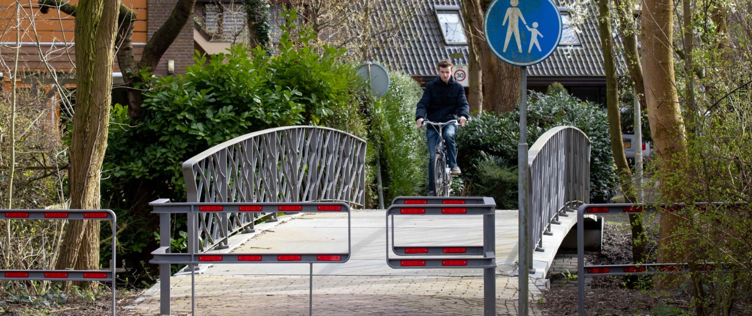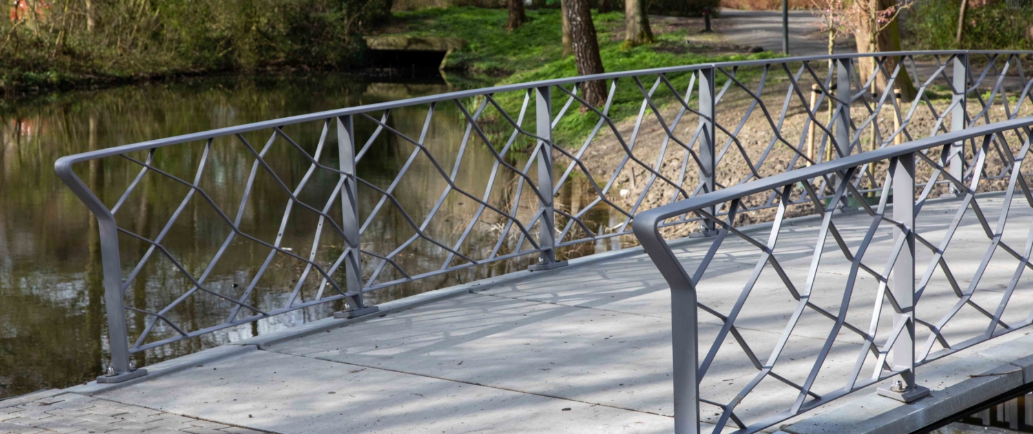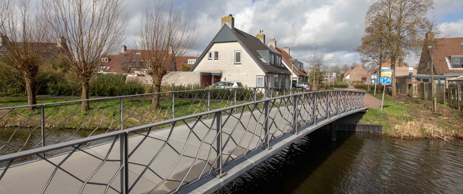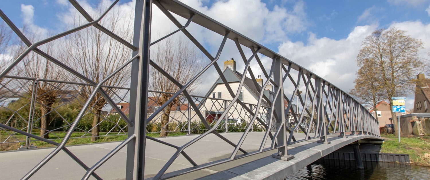 We pasten modulaire brugdekken in UHSB toe op stalen liggers en met het hekwerk dat we eerder al voor de brug aan de Hoflandstraat ontwierpen. Zo ontstaat eenheid en hebben de bruggen in de wijk een duidelijk herkenbare identiteit. Om daar nog aan toe te voegen, is elke brug voorzien van de straatnaam. Deze staat met grote letters op het eerste dekelement en is uitgelijnd met de eindbalusters van het hekwerk.